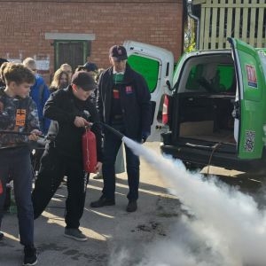 To laikā skolēni iepazinās ar teorētiskajiem jautājumiem, vēroja ugunsdzēšamā aparāta pielietošanas demonstrāciju, kā arī paši izmēģināja uguns dzēšanu.