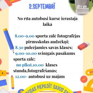 Gaidīsim visus Staļģenes skolēnus uz svinīgo Zinību dienu, pirmdien, 2.septembrī plkst. 8.30, lai kopā uzsāktu jauno, 2024./25. mācību gadu un atkal tiktos ar klases un skolas biedriem.