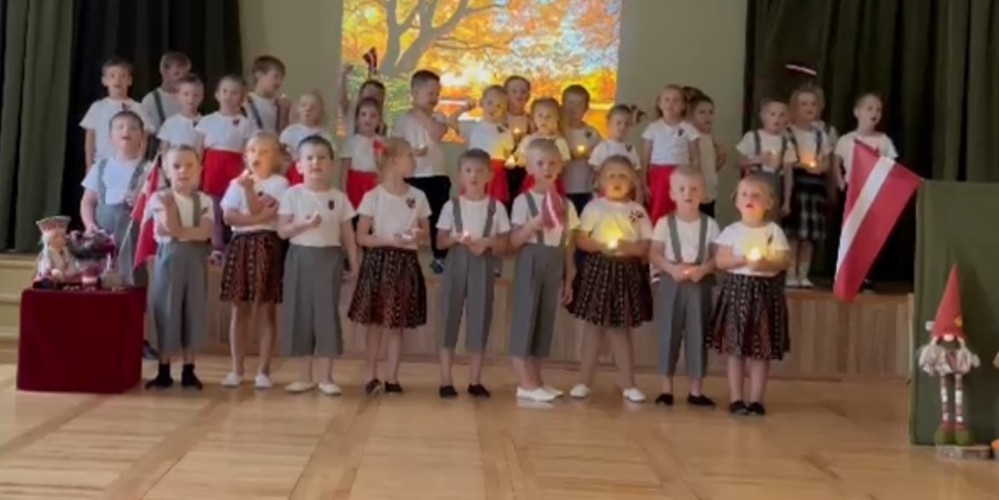 Staļģenes pirmsskolas grupiņas “Rūķi,” “Skudriņas” un “Bitītes” sveic Latviju 107.dzimšanas dienā. Liels prieks izpildīt Mārtiņa Bergmaņa īpašo dziesmu “Mīļa mana Latvija.”
